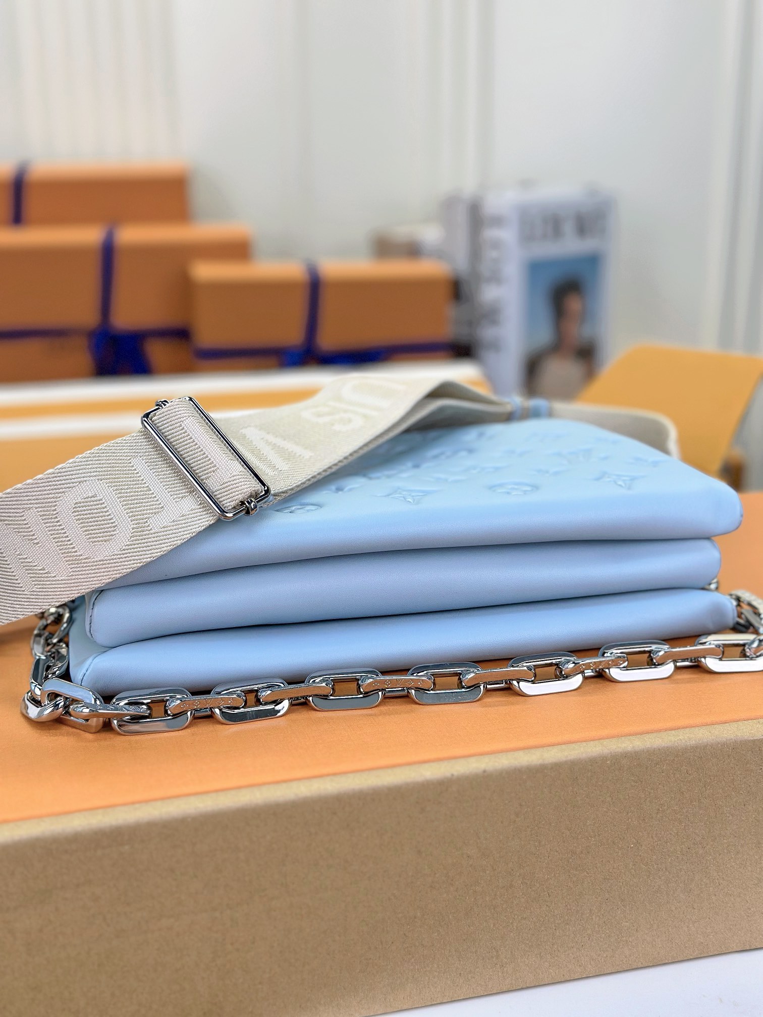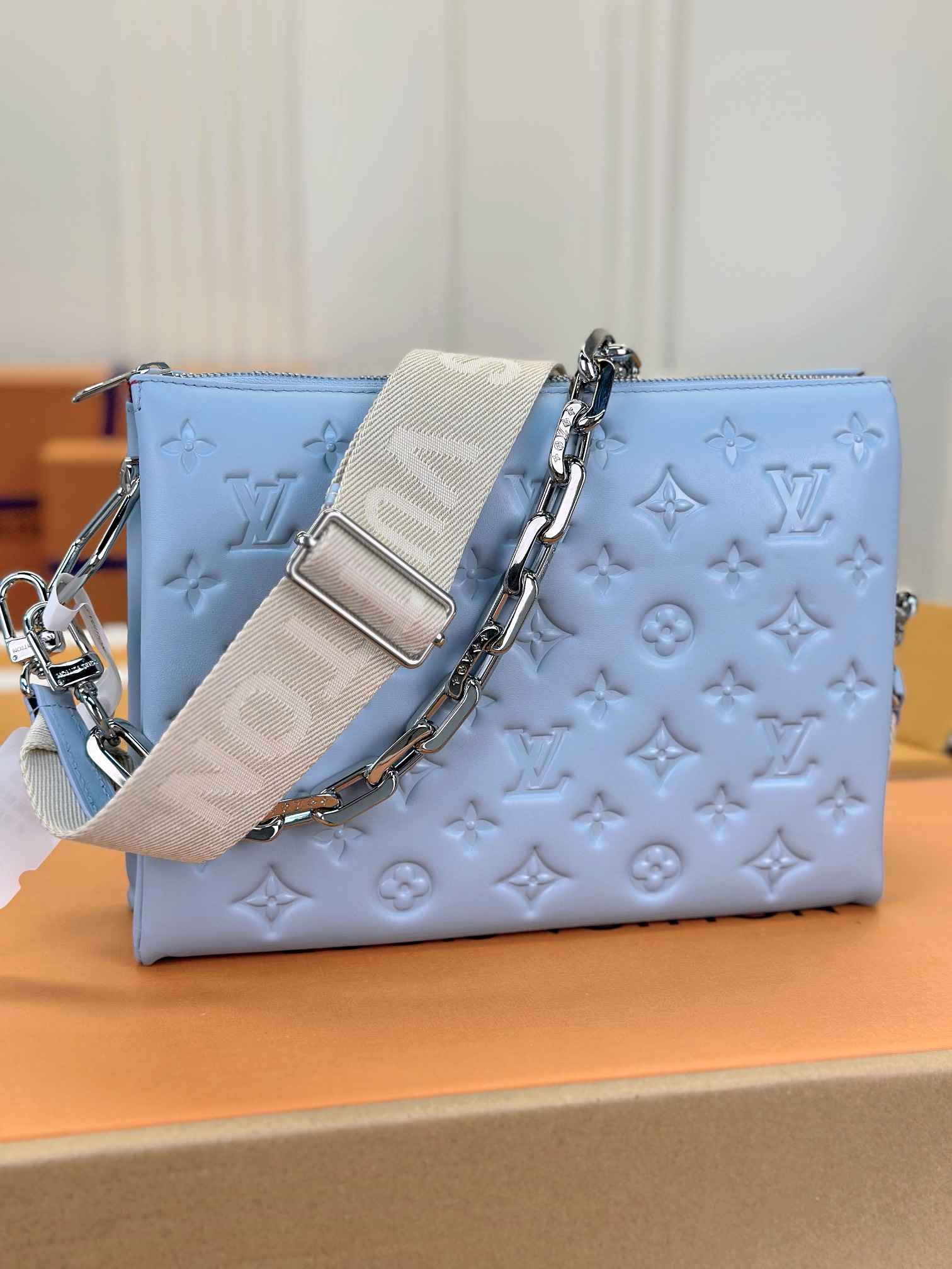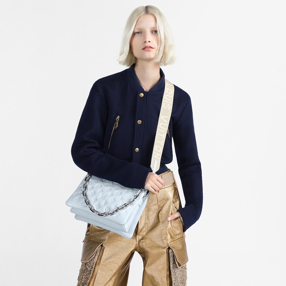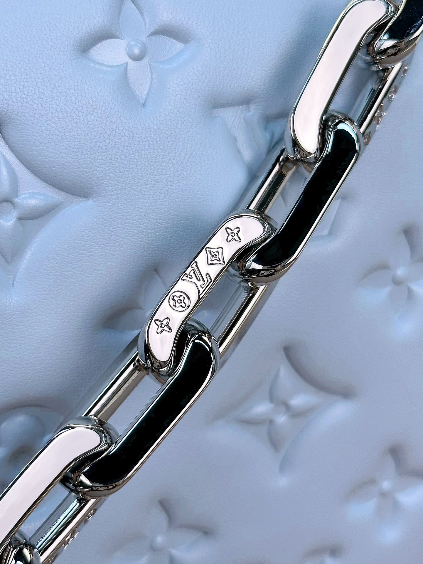 루이비통 쿠상 PM 백 실버 체인 스카이블루