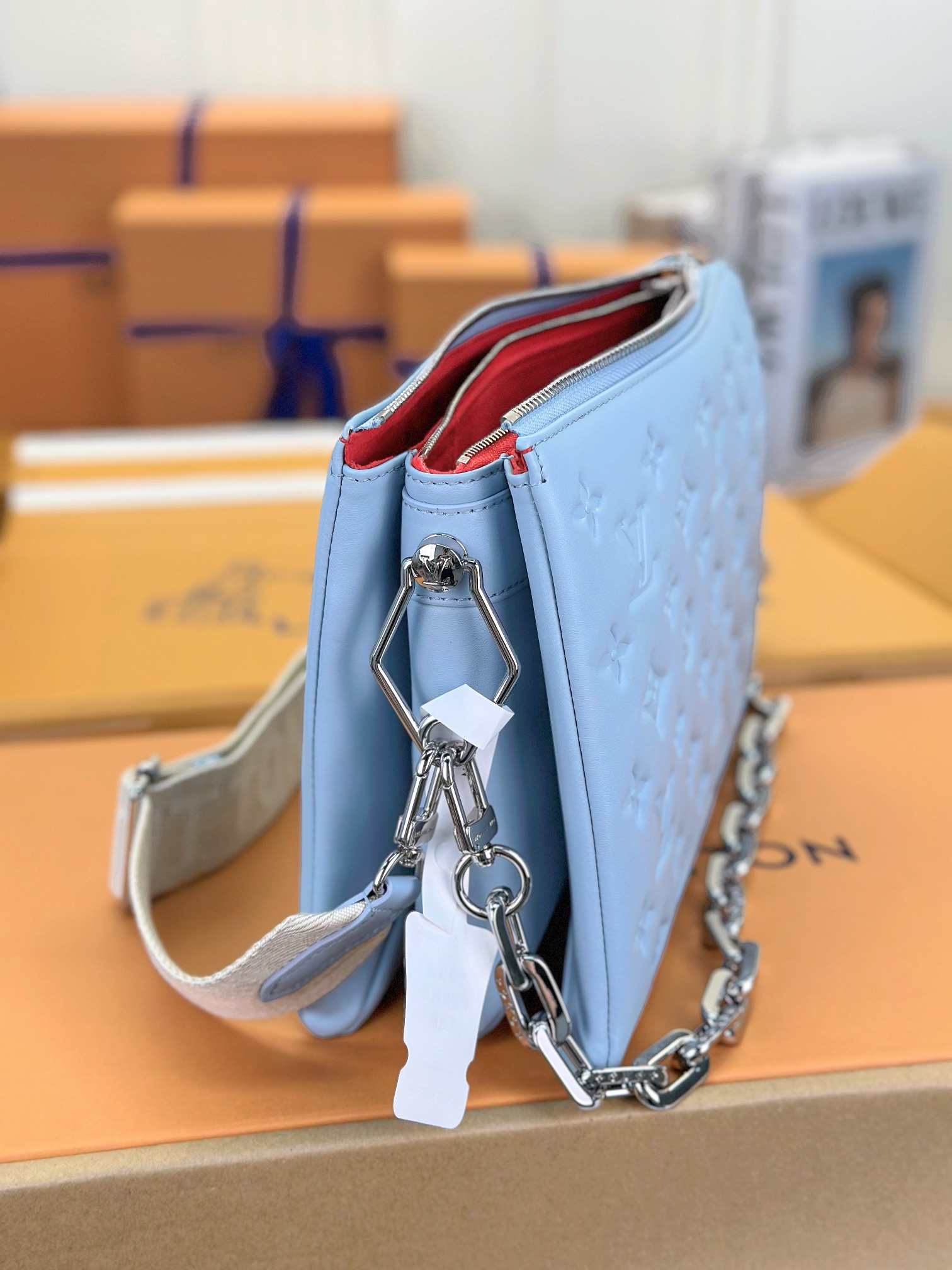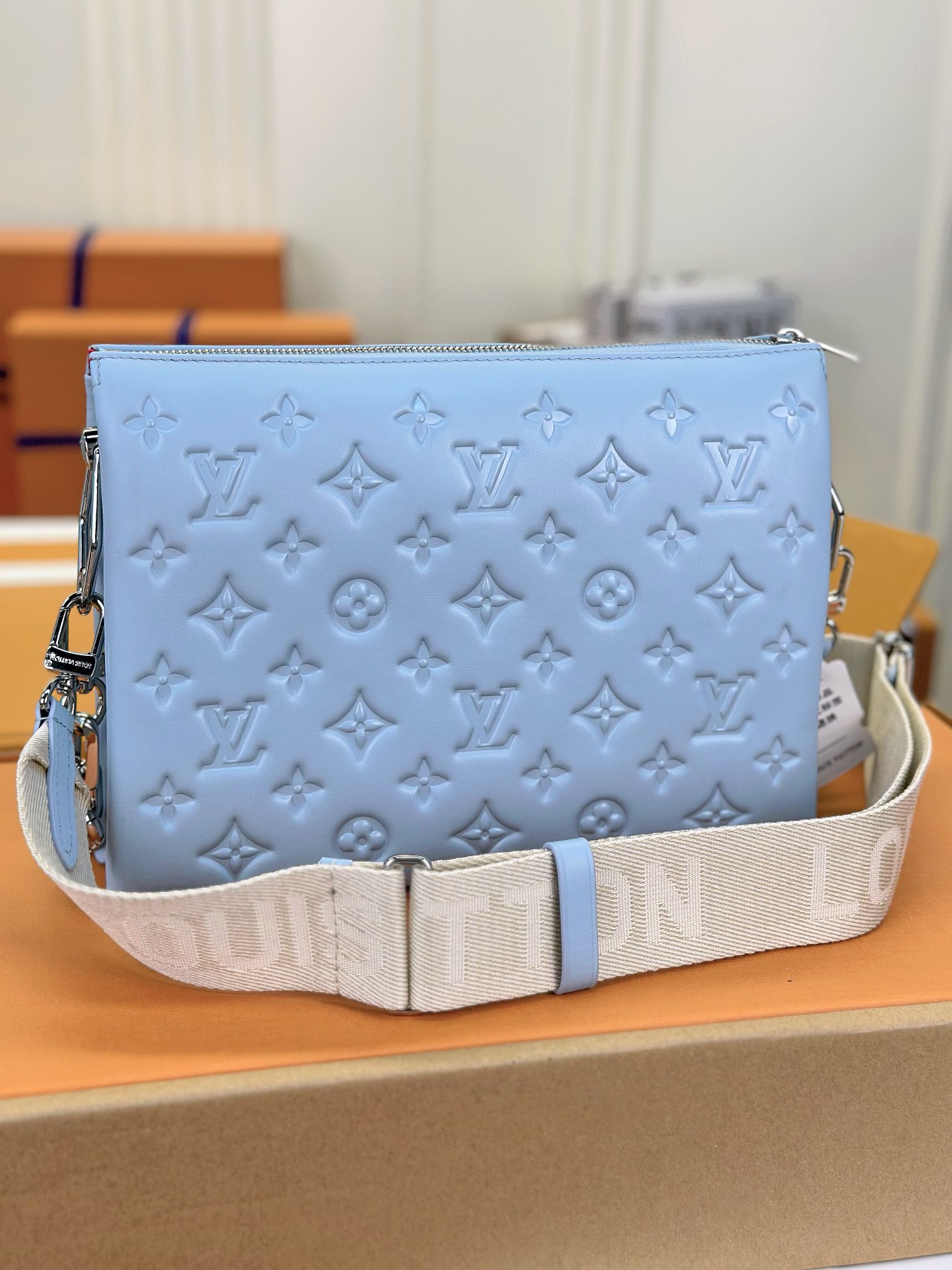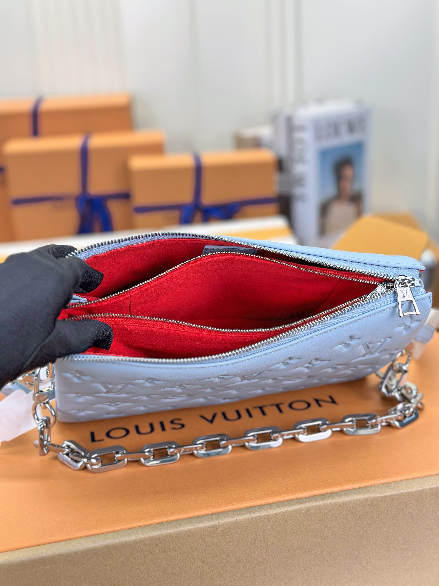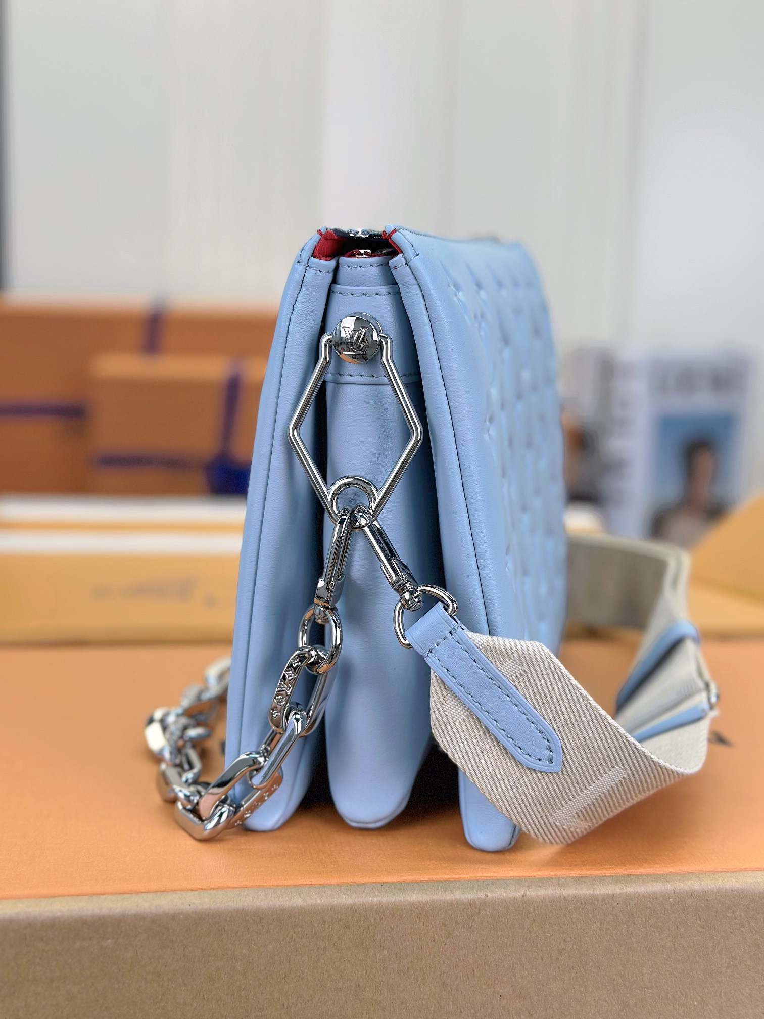 루이비통 쿠상 PM 백 실버 체인 스카이블루