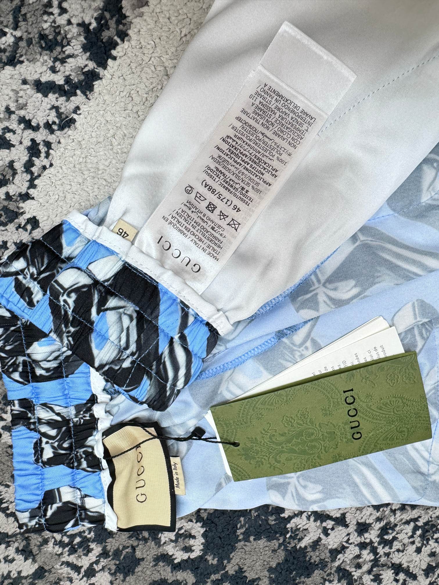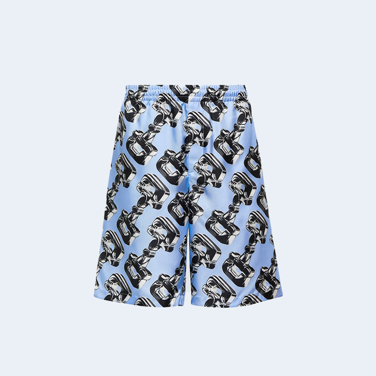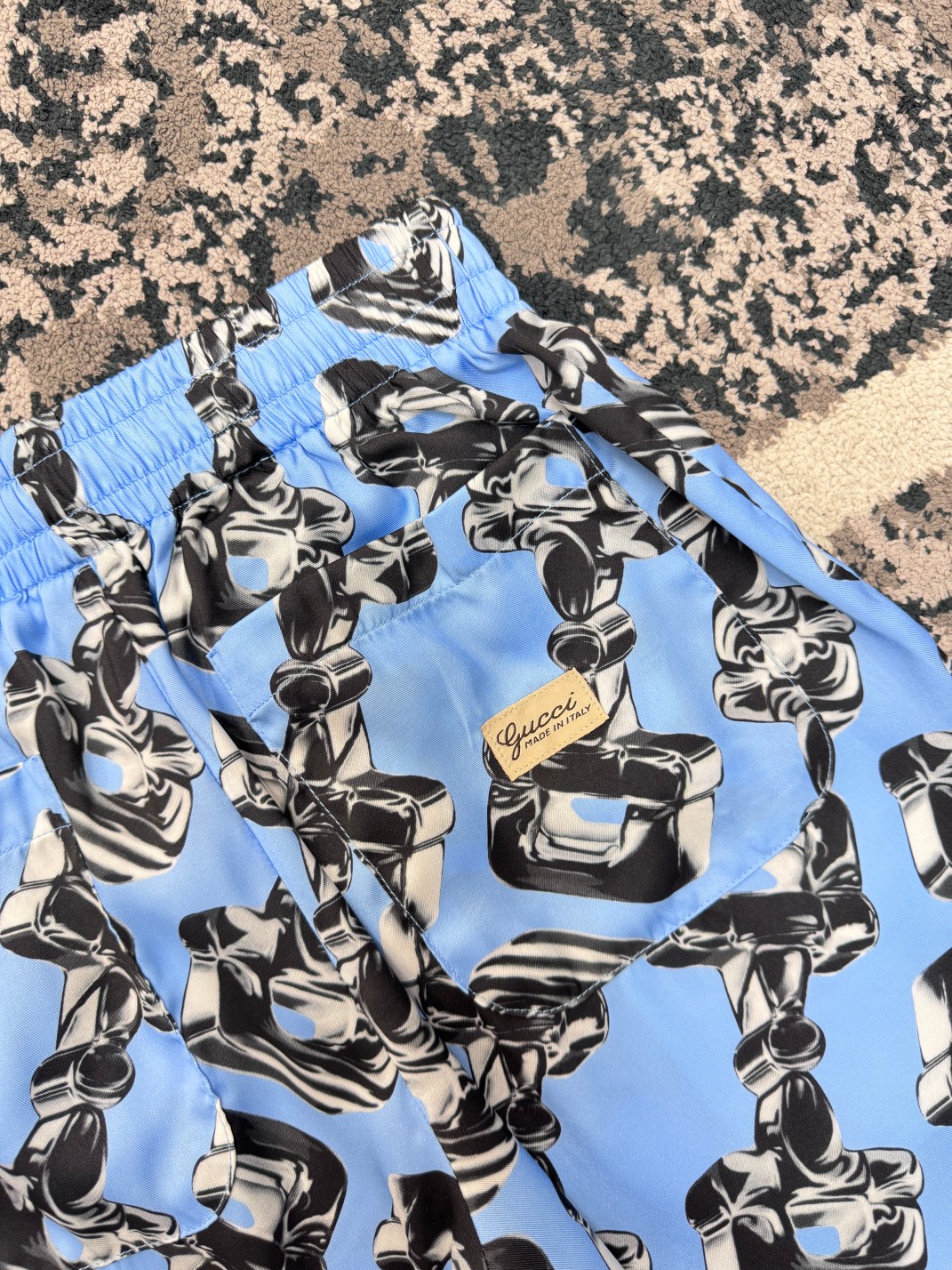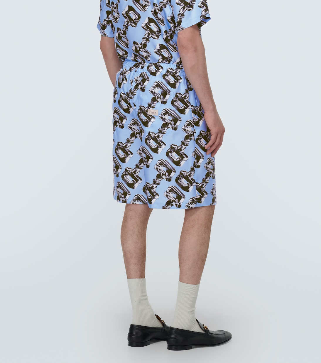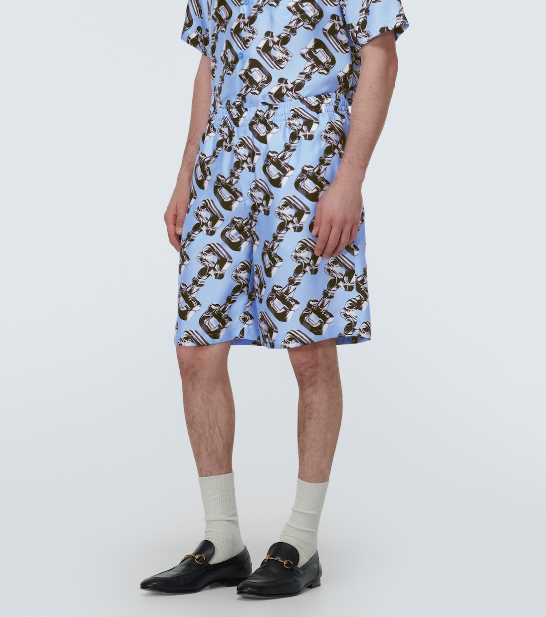 구찌 드로우스트링 홀스빗 프린트 실크 쇼츠 블루