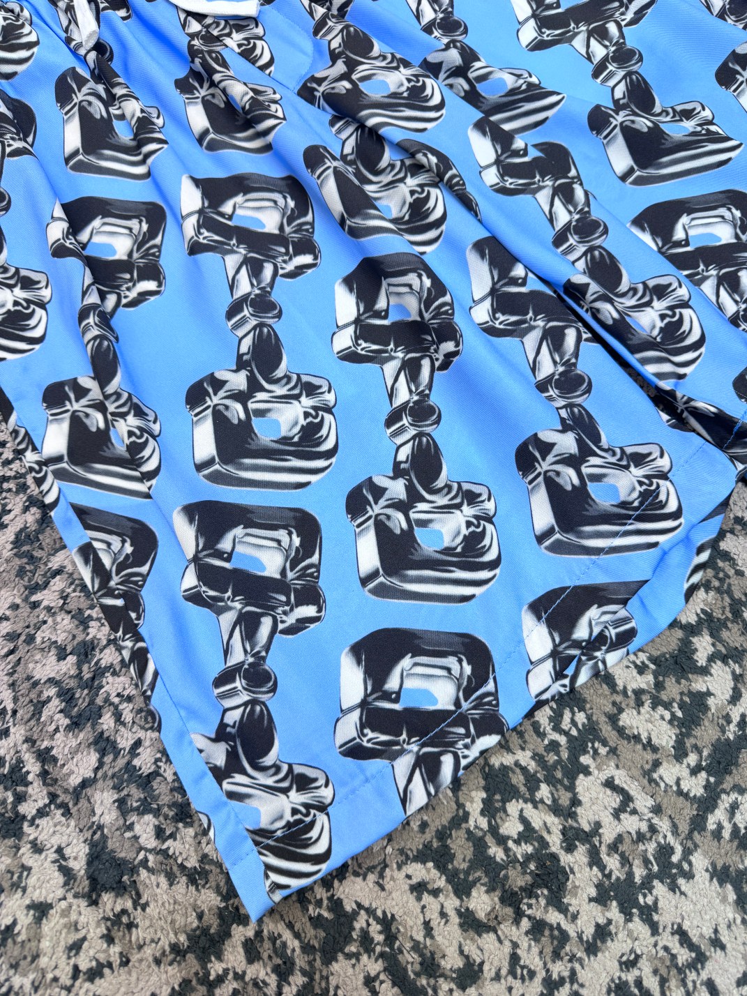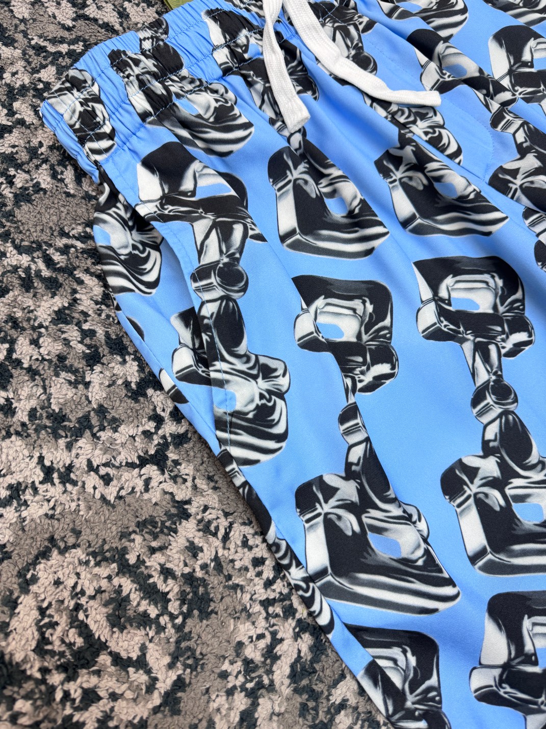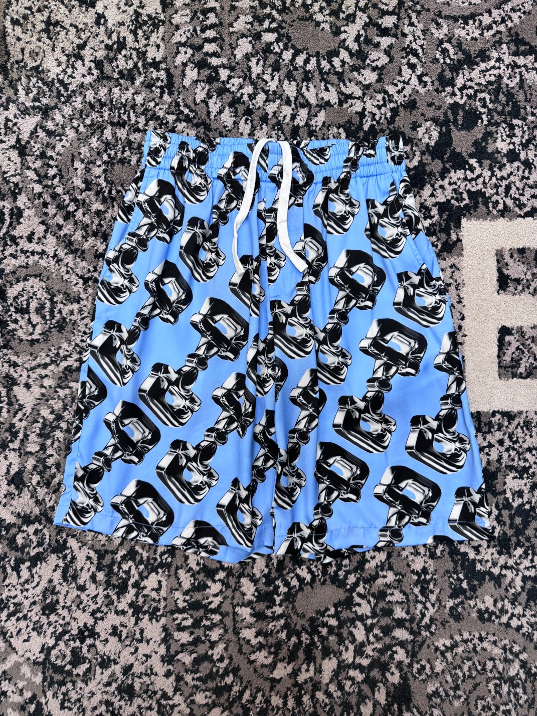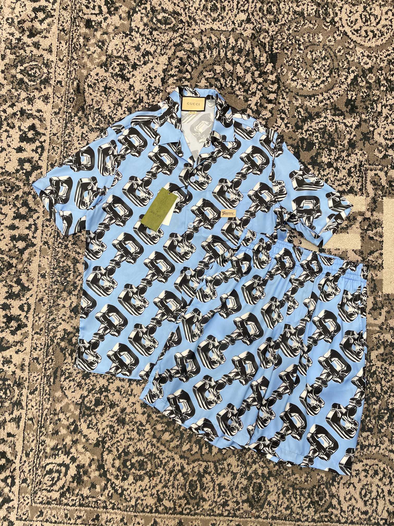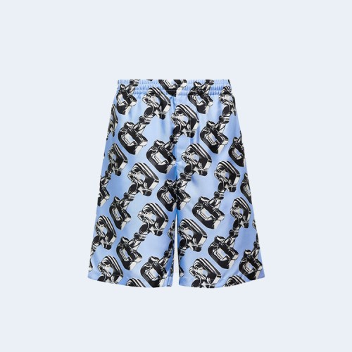 구찌 드로우스트링 홀스빗 프린트 실크 쇼츠 블루