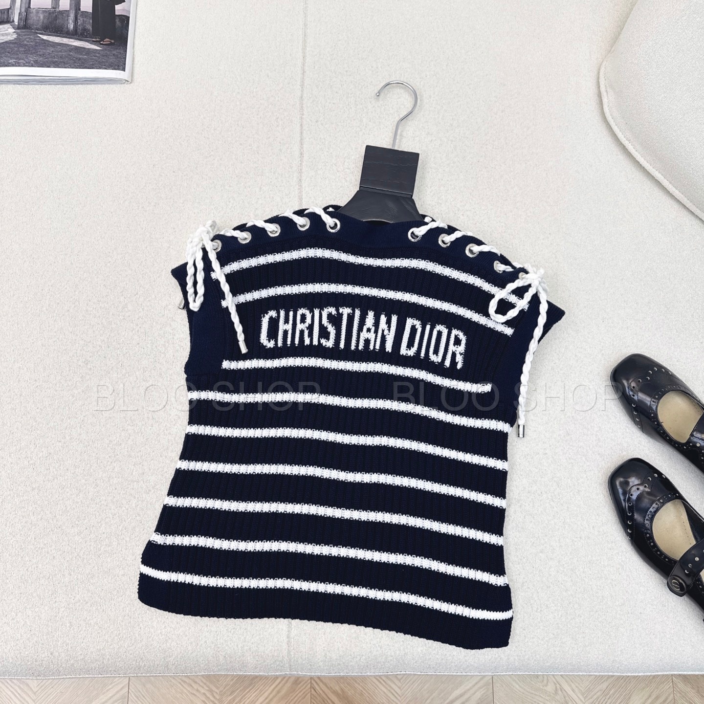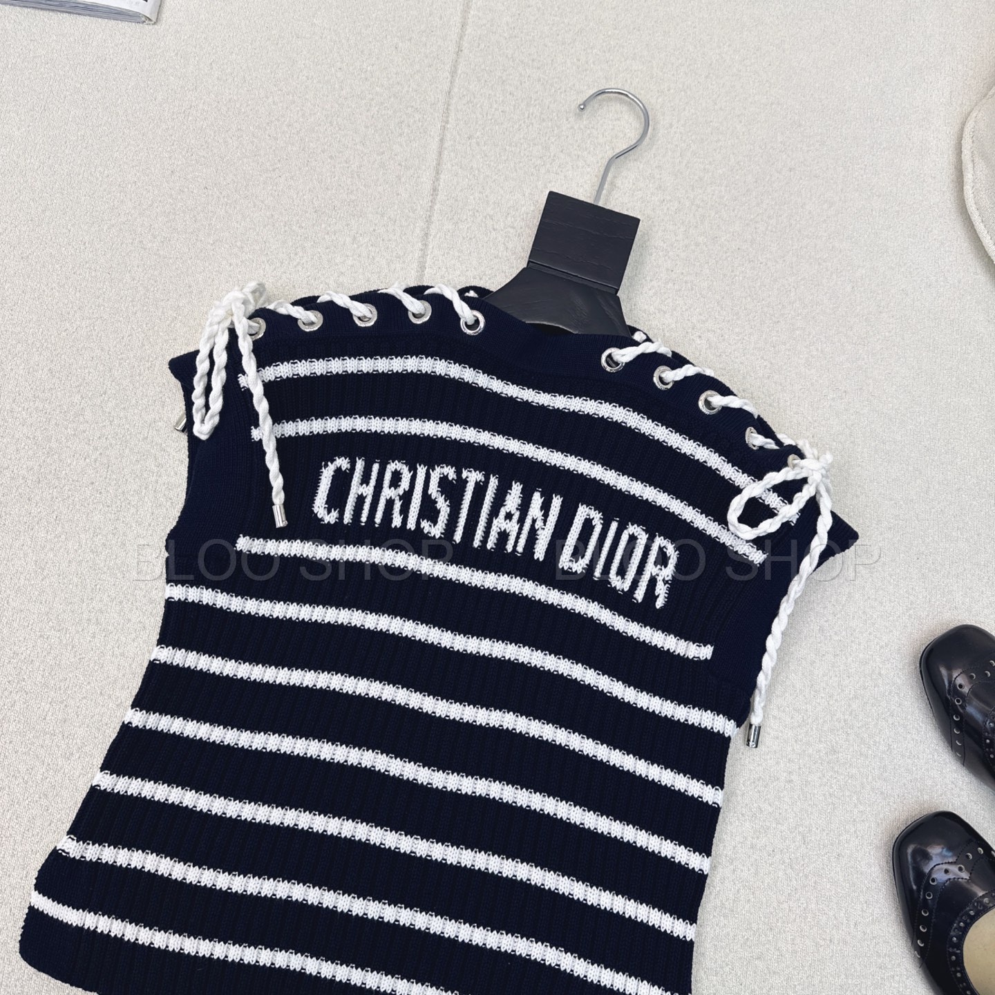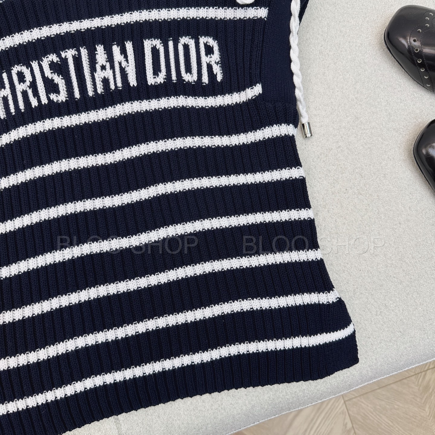 디올 Dioriviera 스트라이프 레이스업 캡 슬리브 스웨터