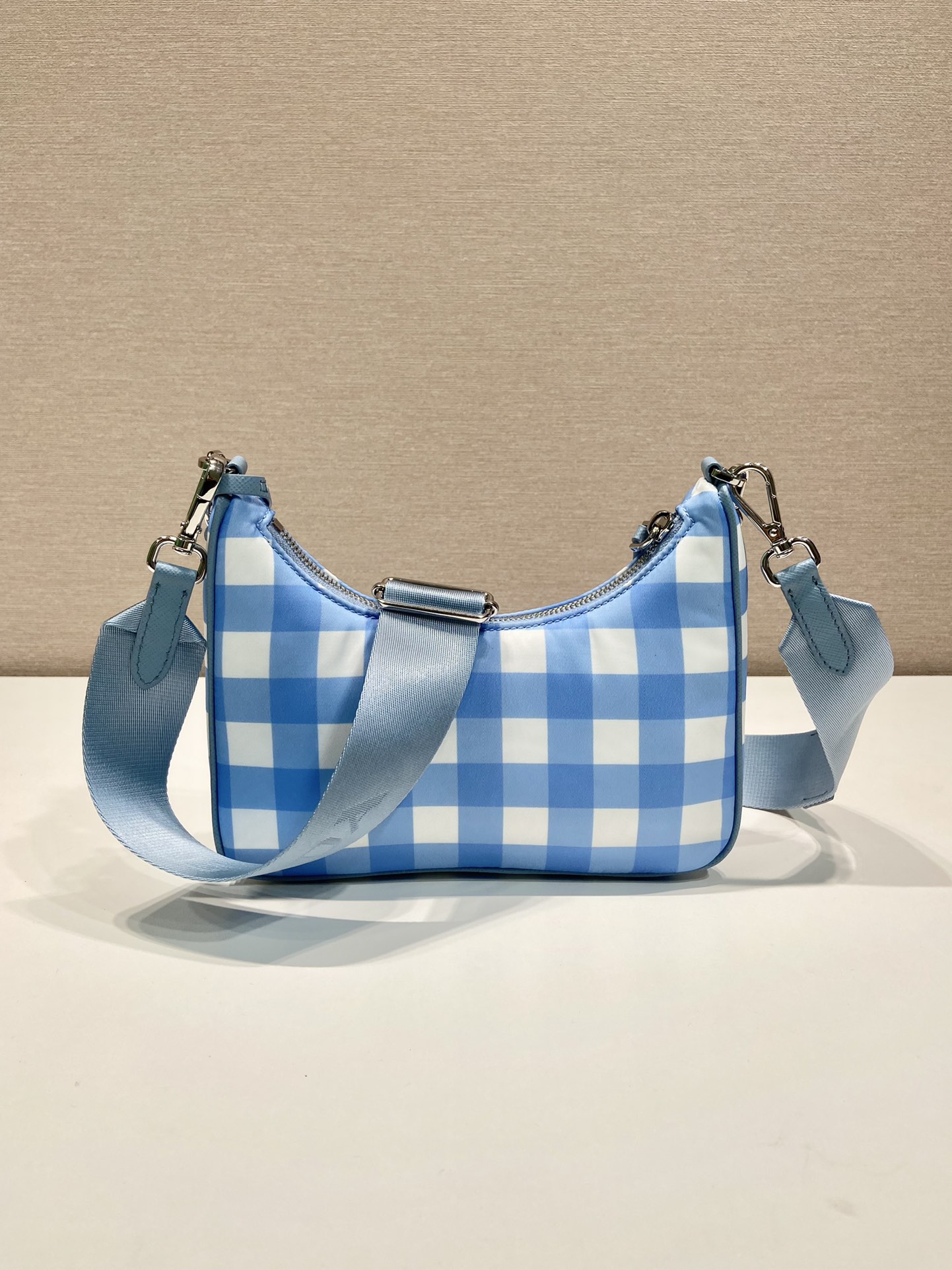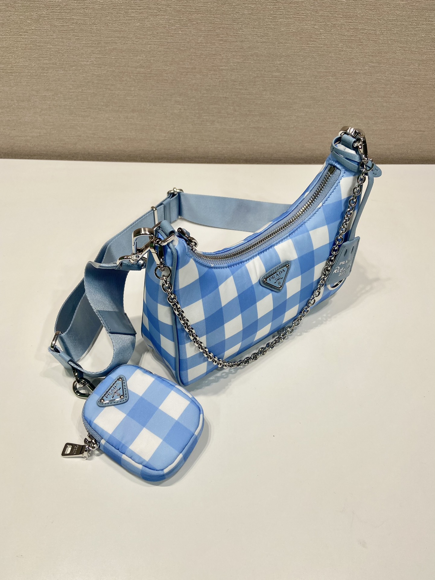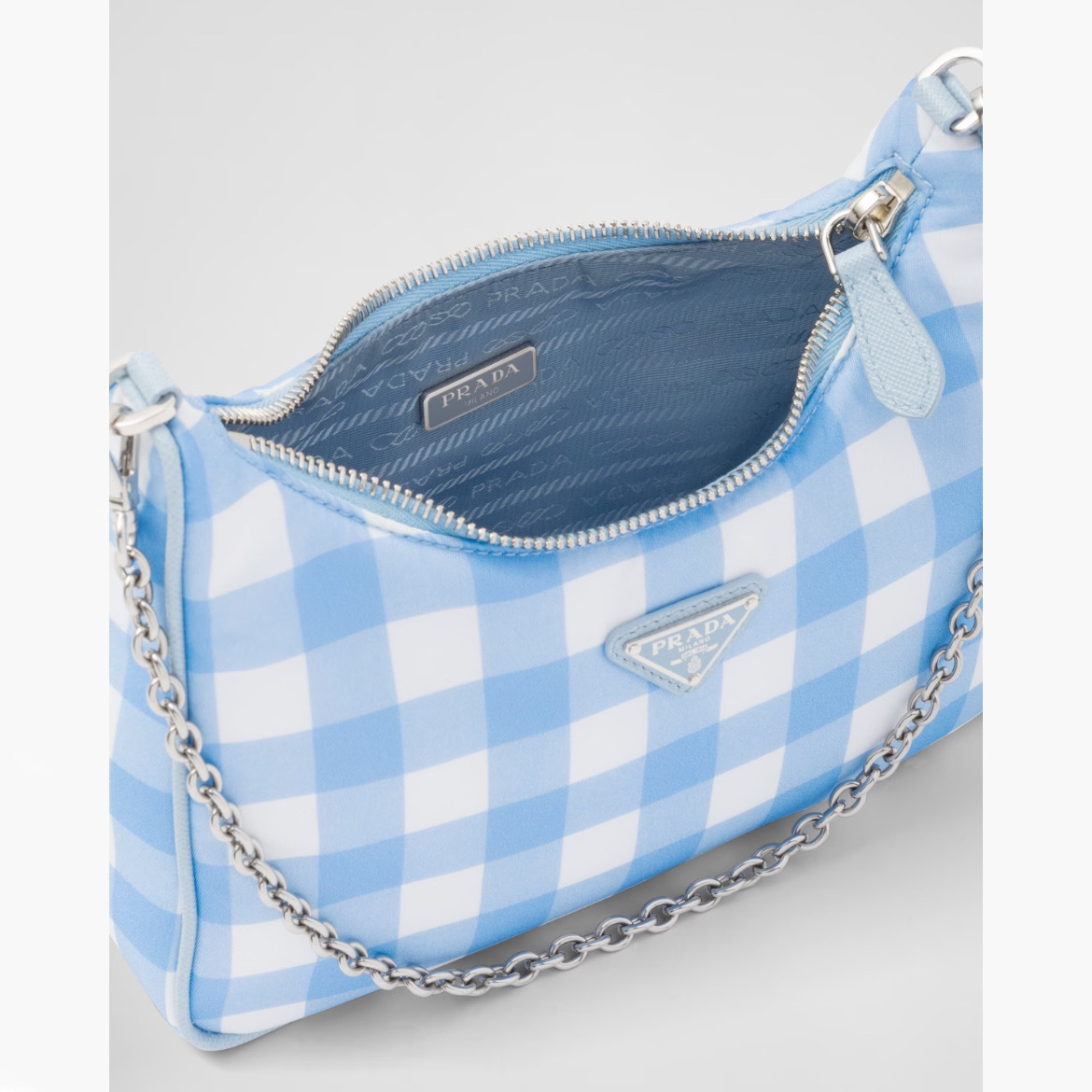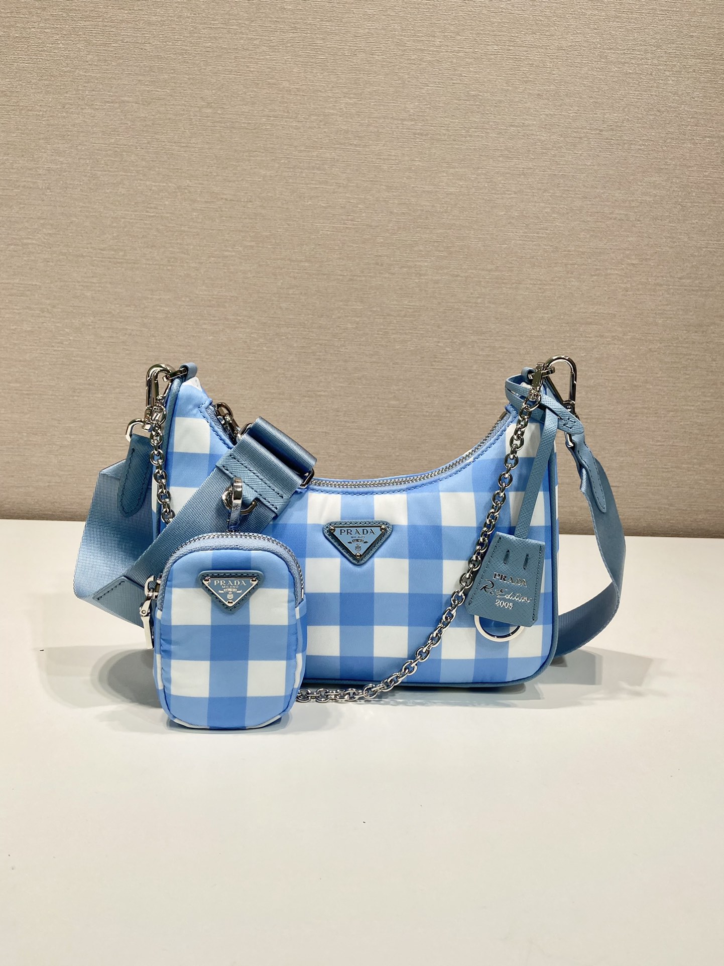 프라다 리에디션 2005 리나일론 체크 숄더백 라이트블루