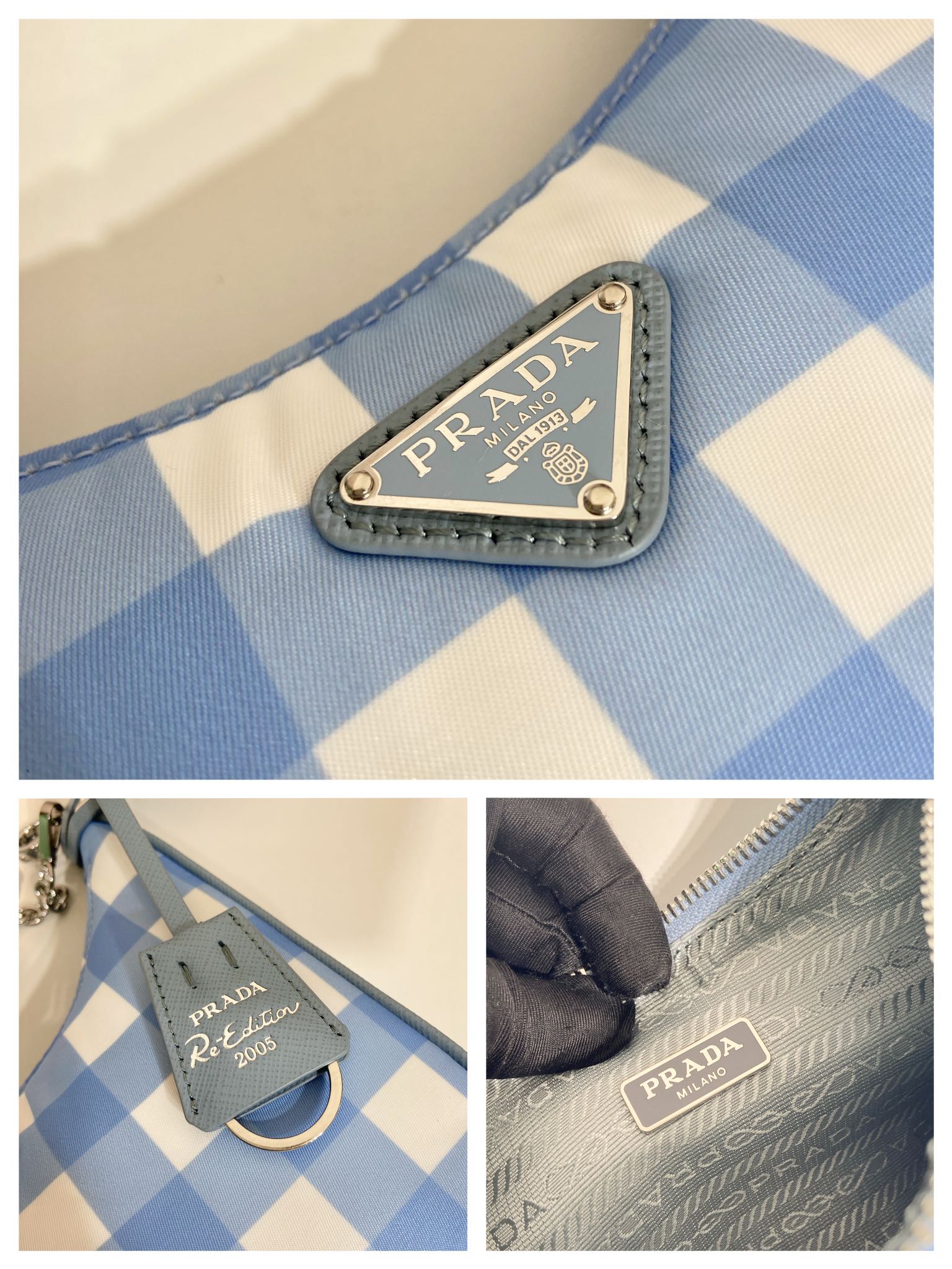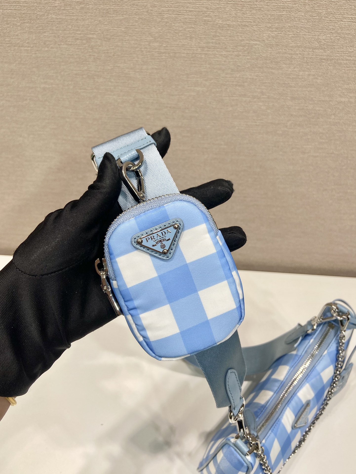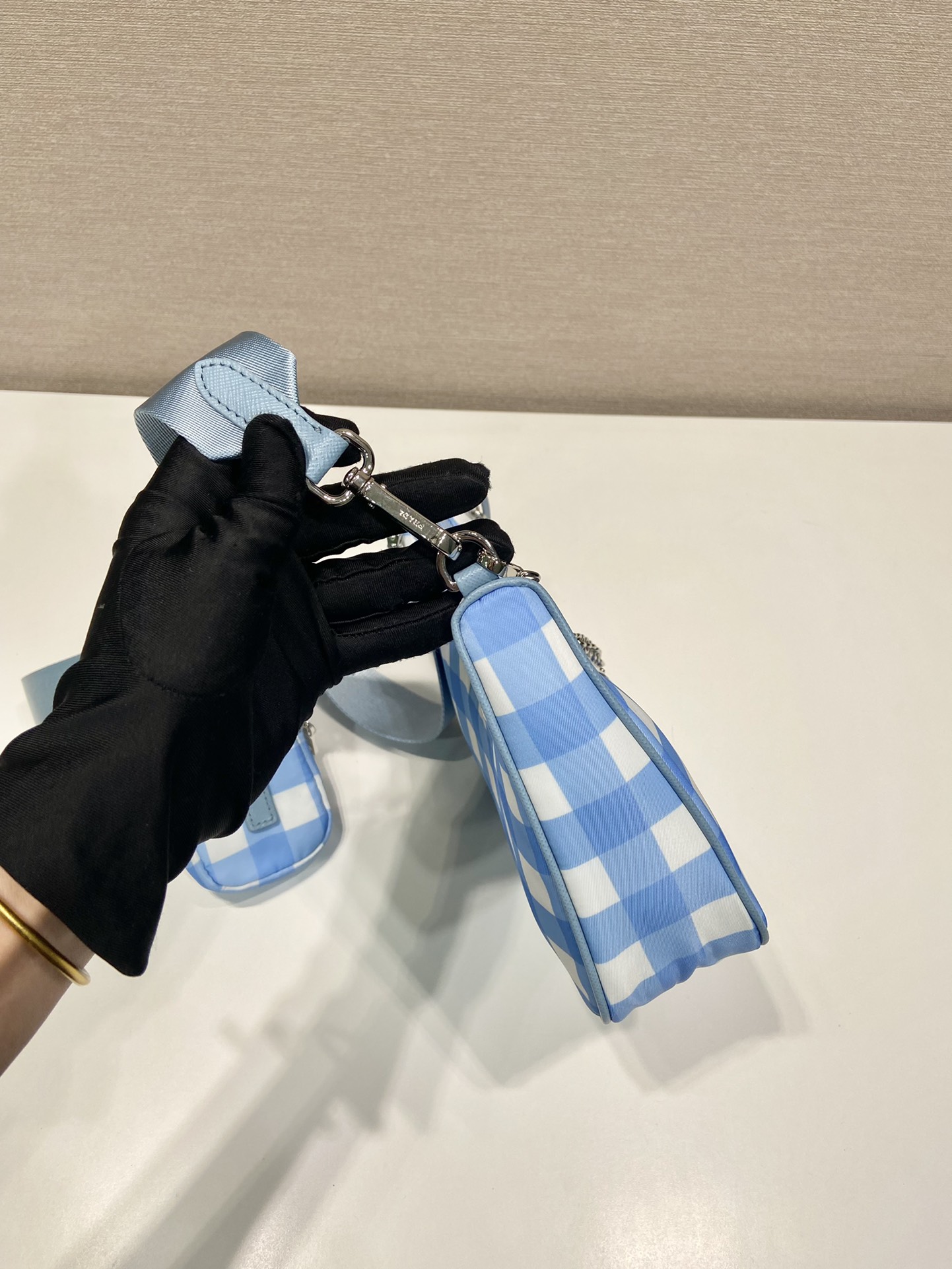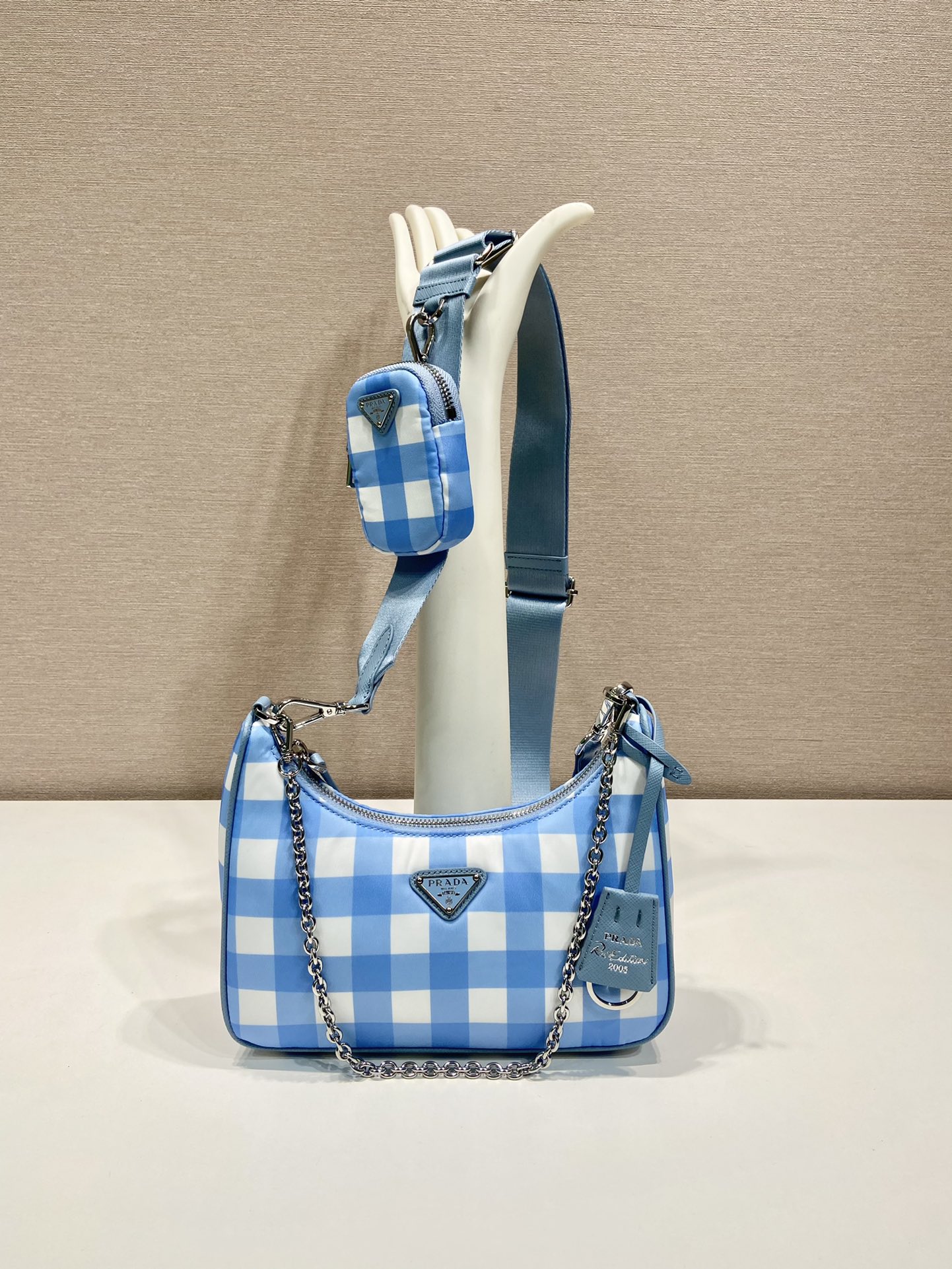 프라다 리에디션 2005 리나일론 체크 숄더백 라이트블루