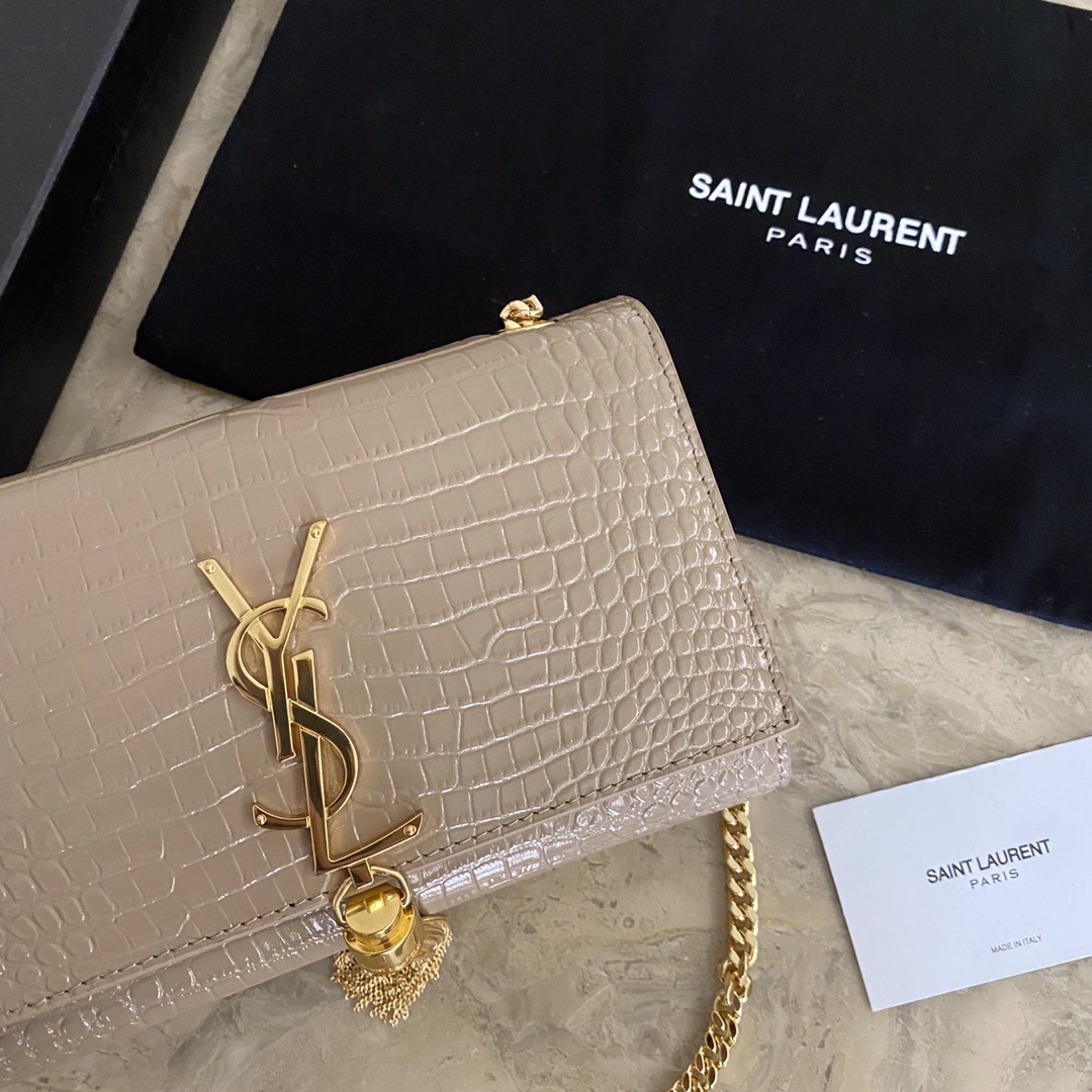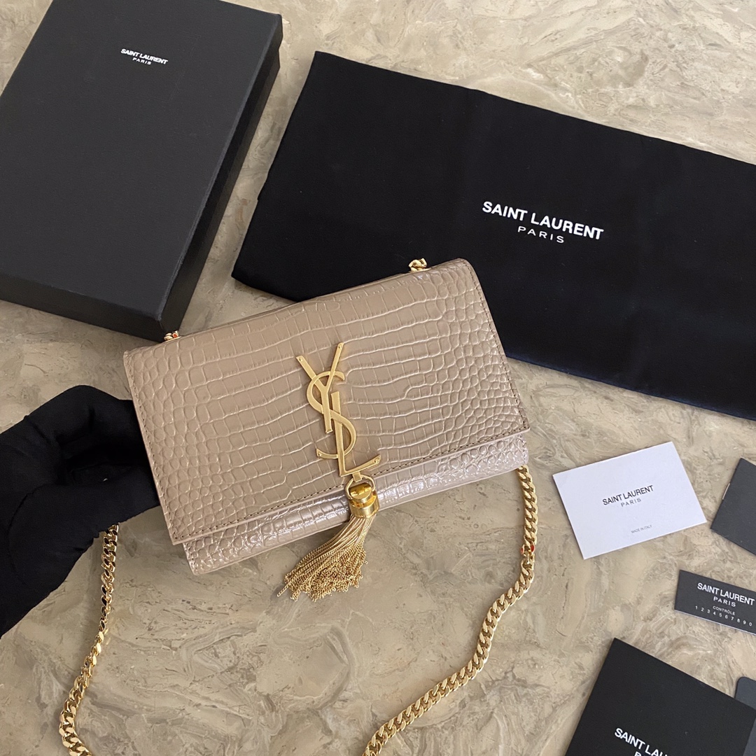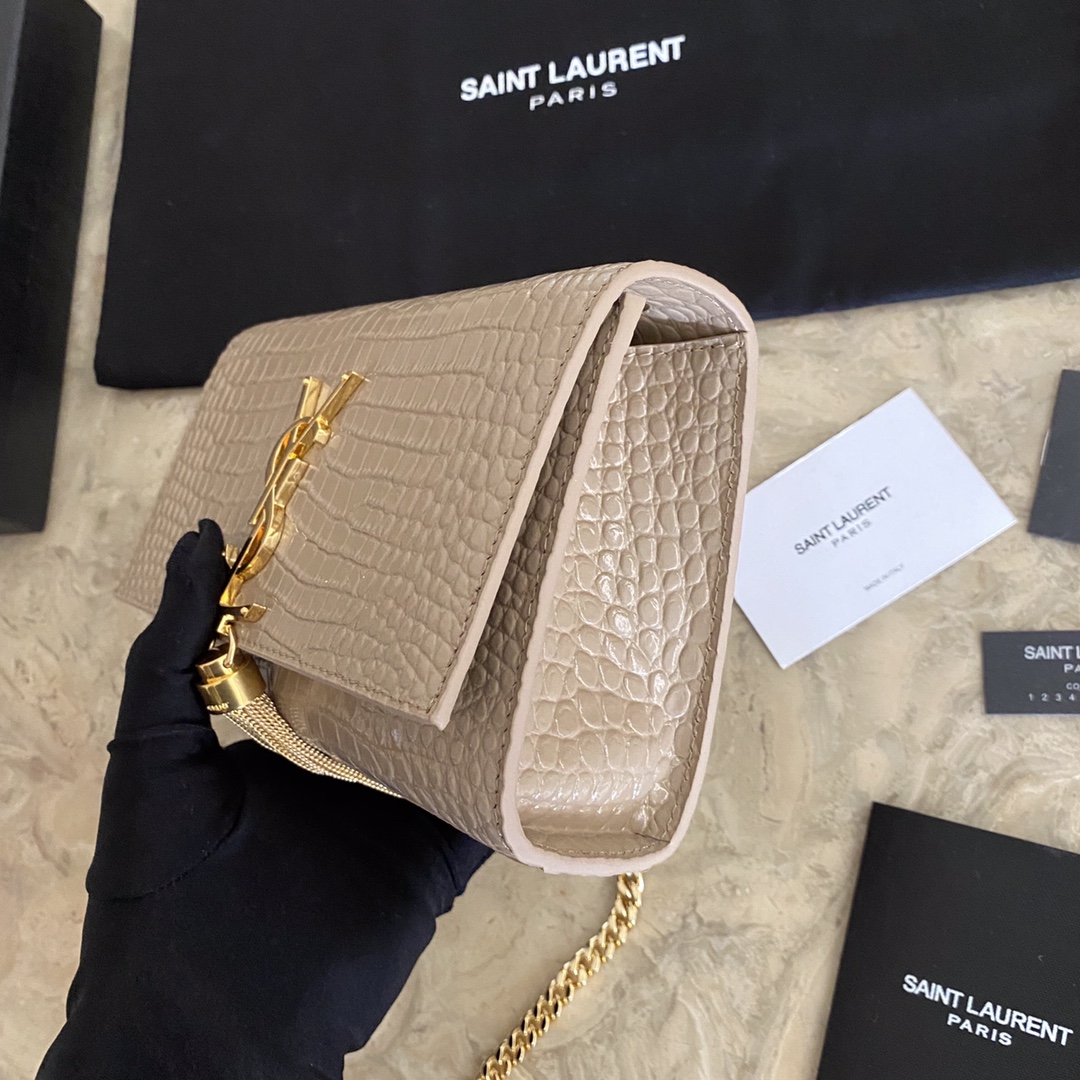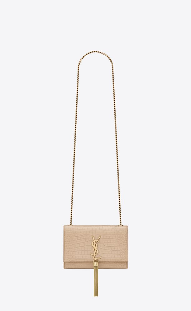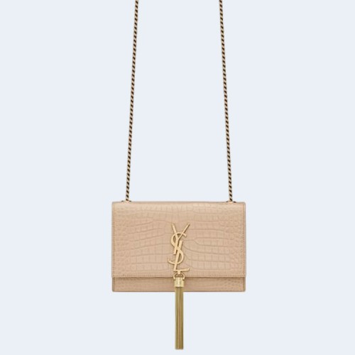 생로랑 크로커다일 케이트 스몰 태슬백 베이지 골드