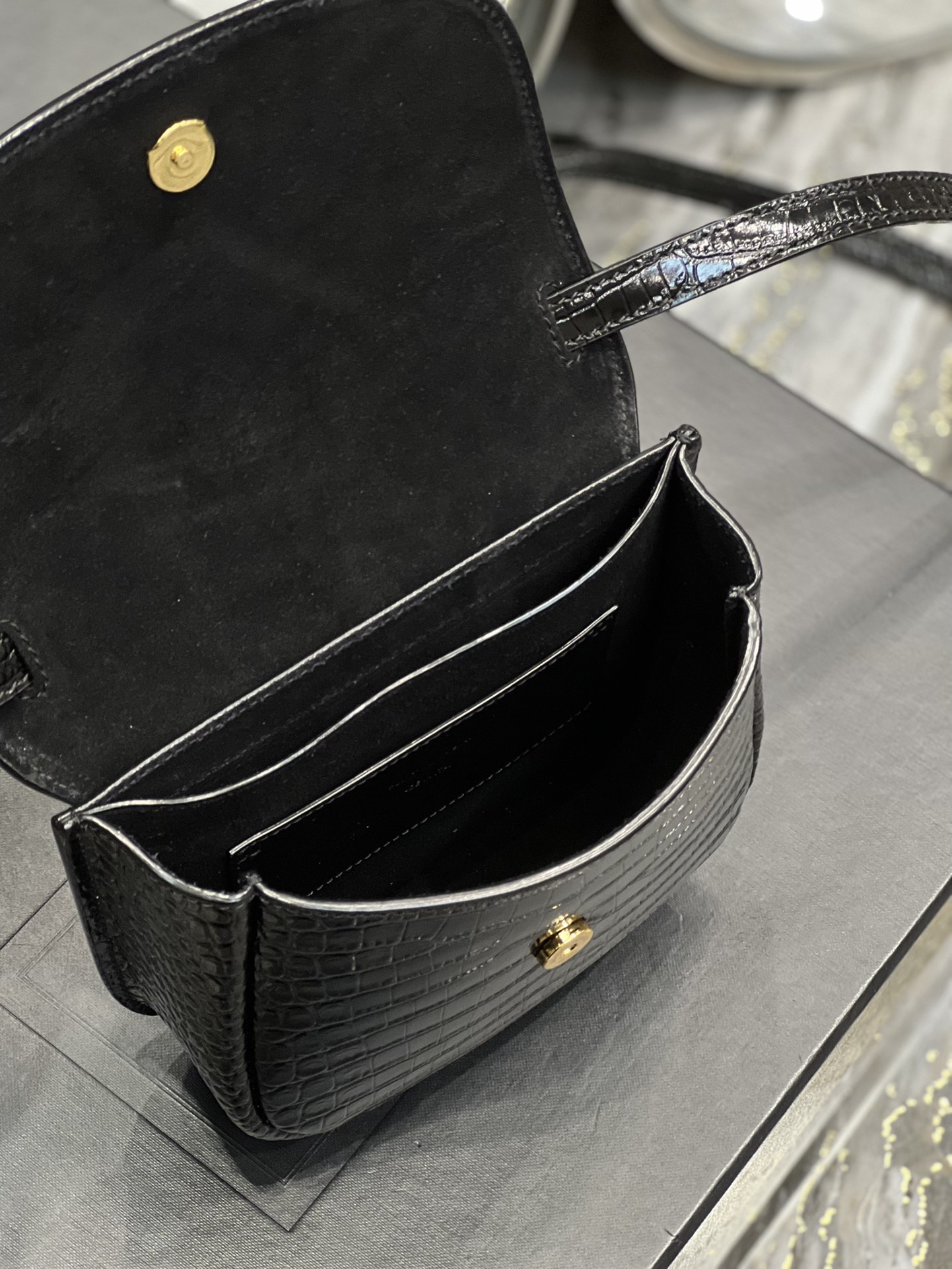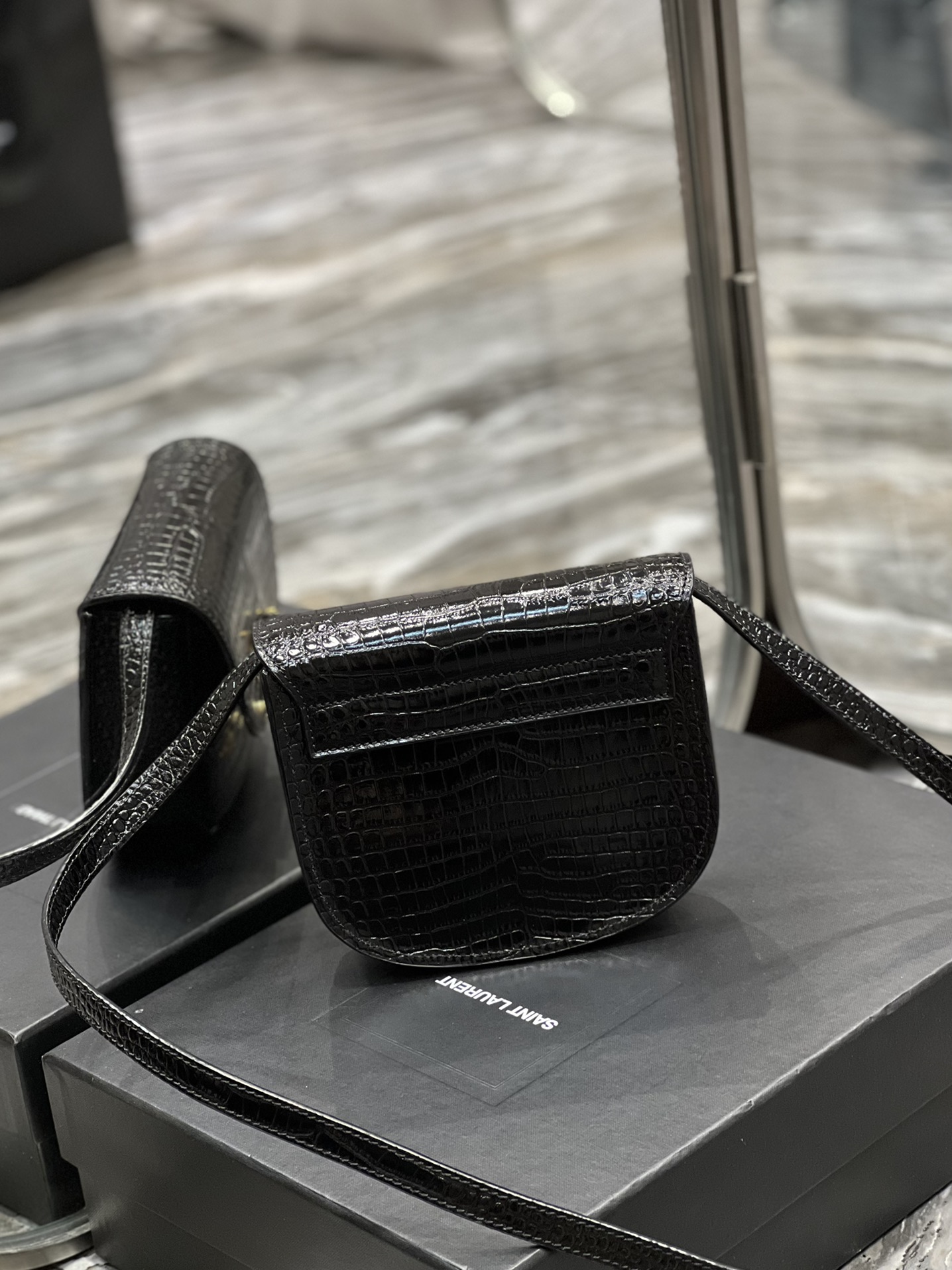 생로랑 크로커다일 카이아 스몰 샤첼백 블랙 골드