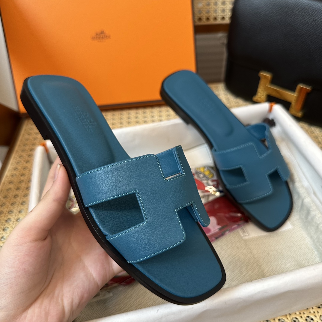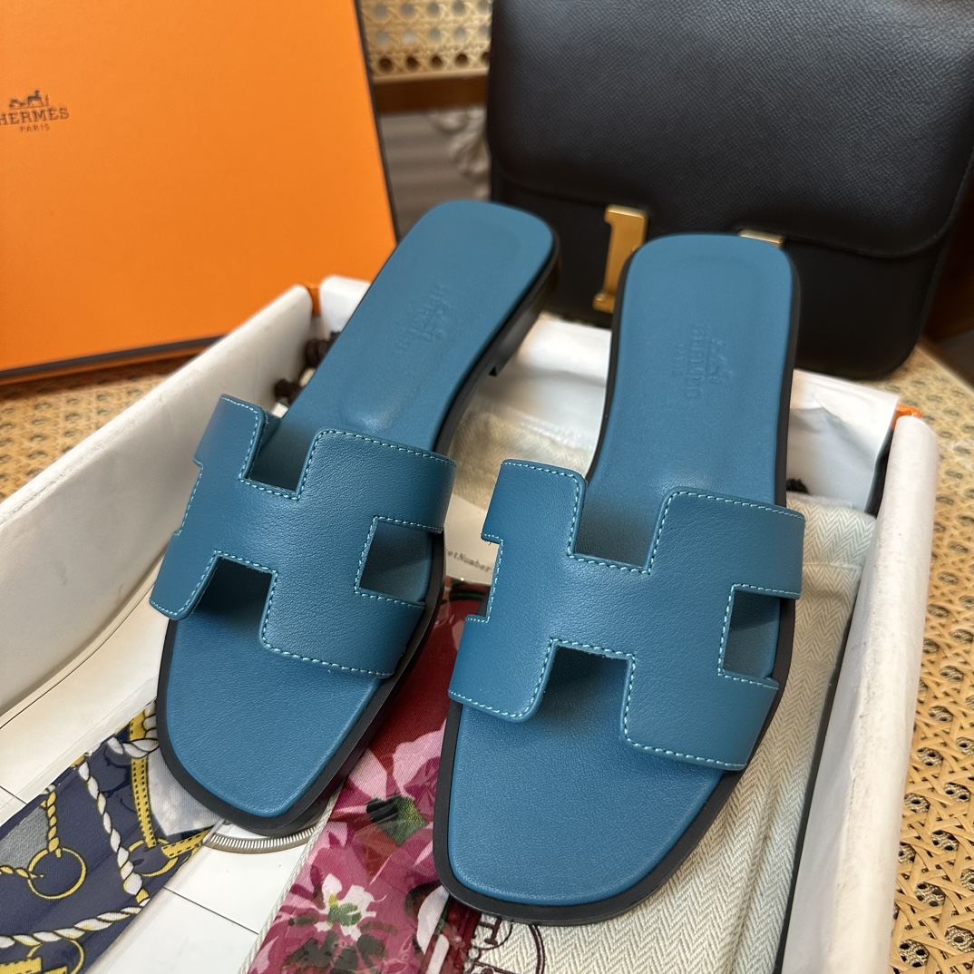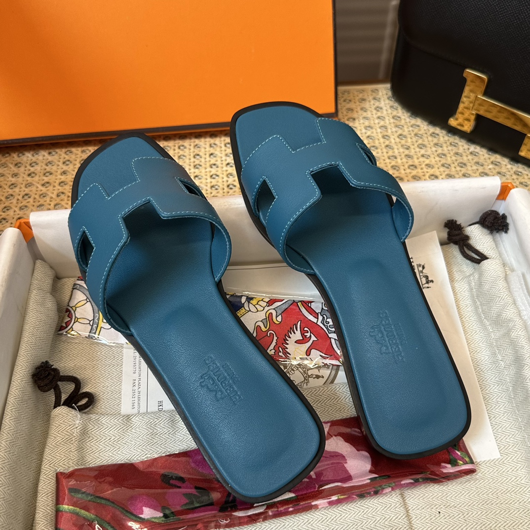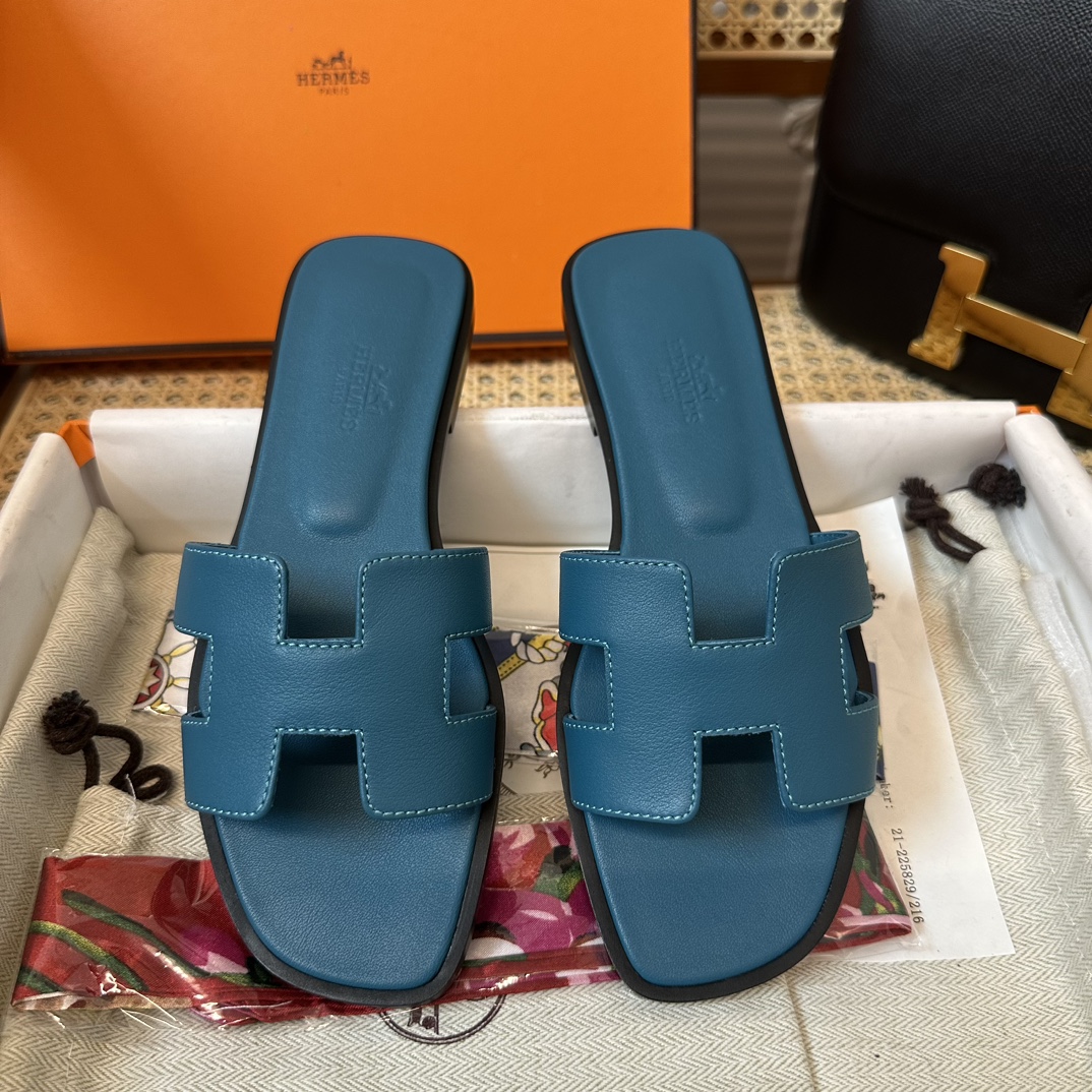 에르메스 오란 샌들 카프스킨 & 블루 에메랄드