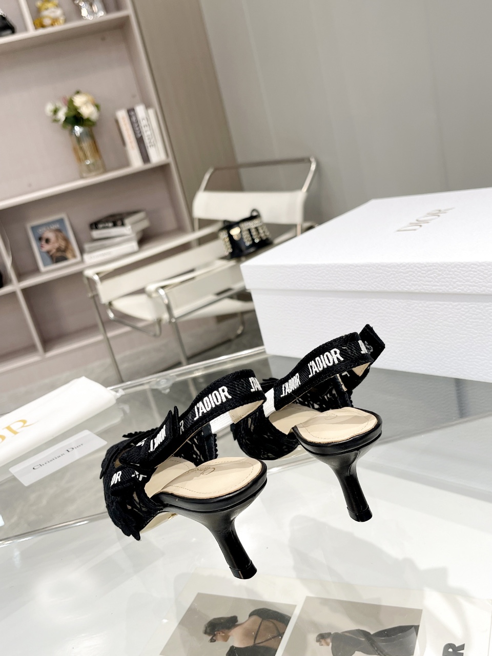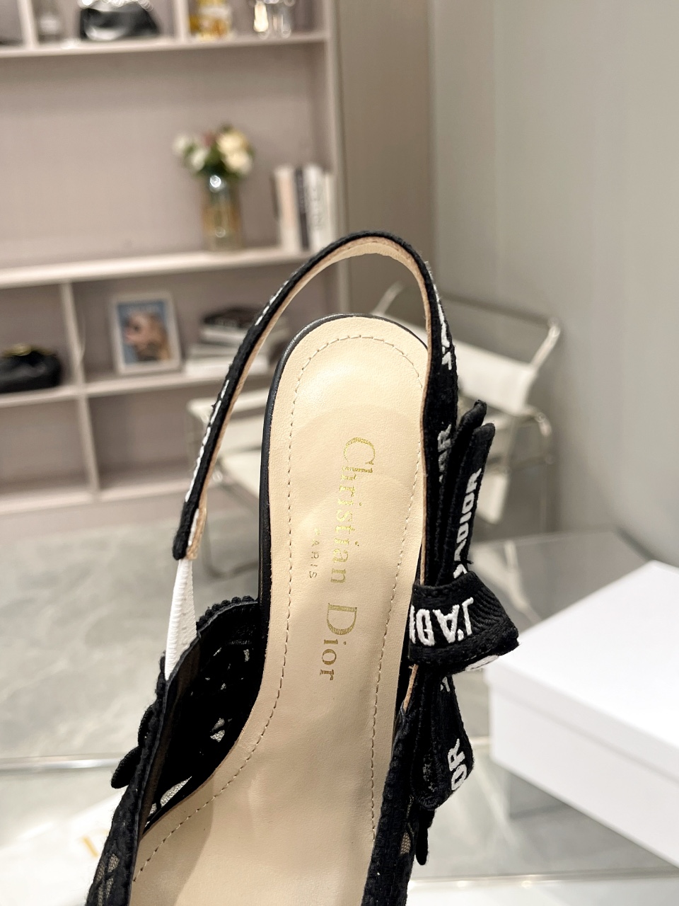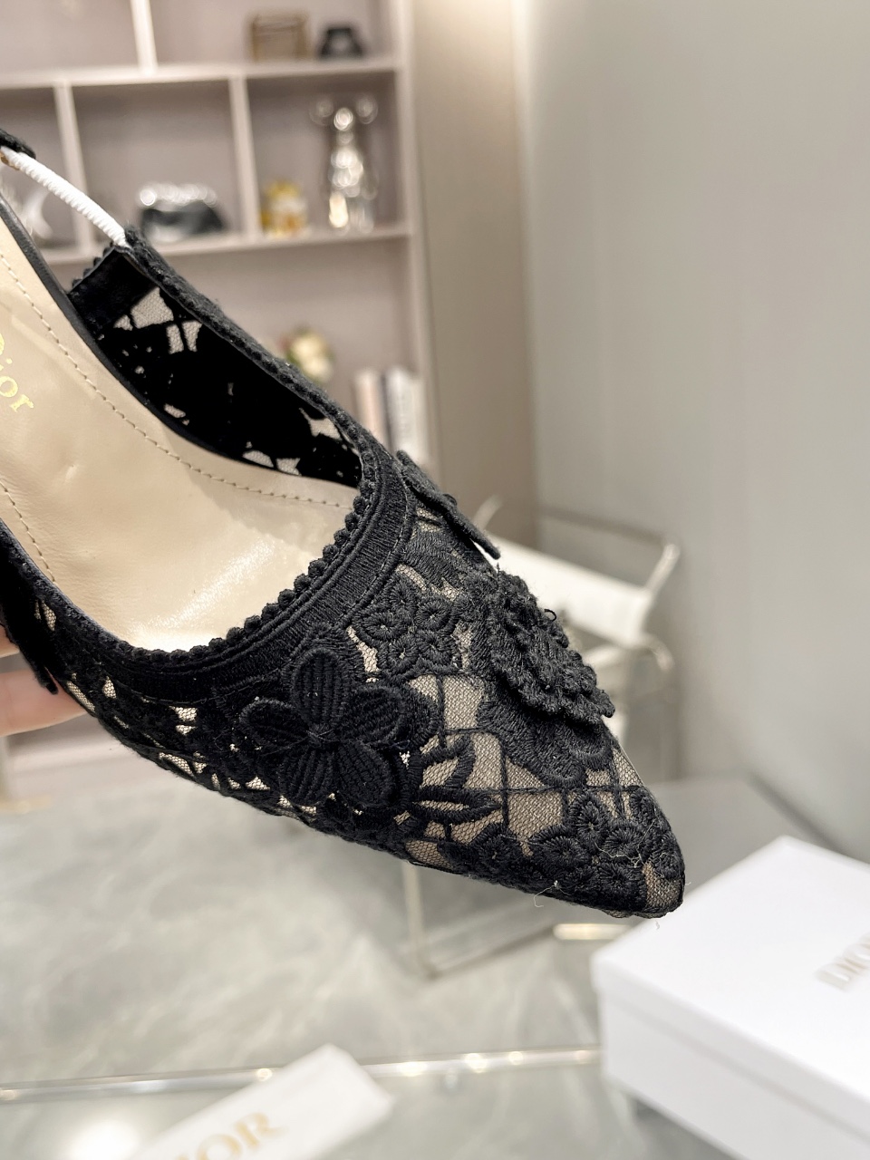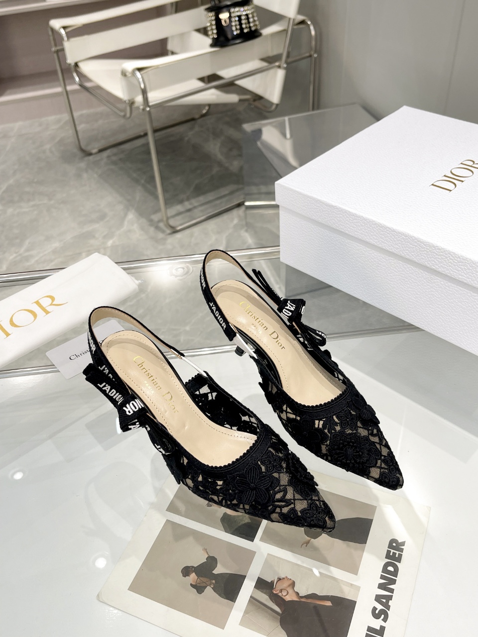디올 자디올 레이스 슬링백 블랙 메쉬 미드힐