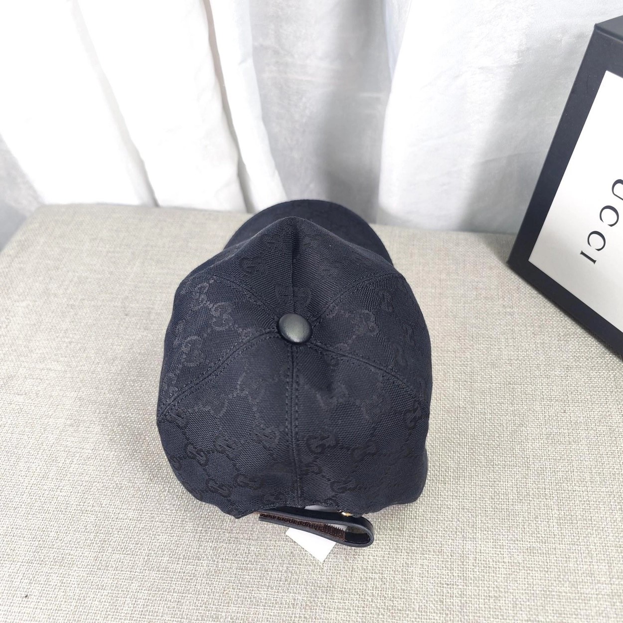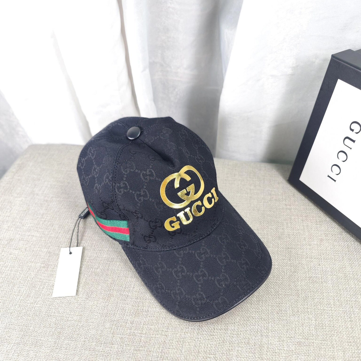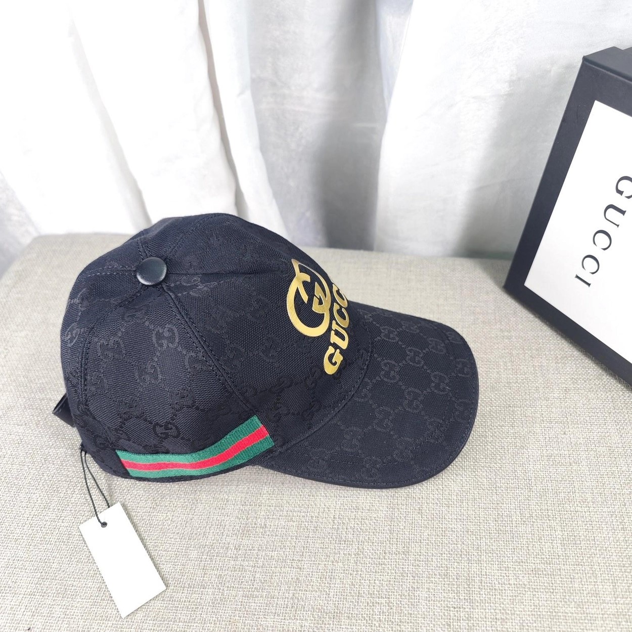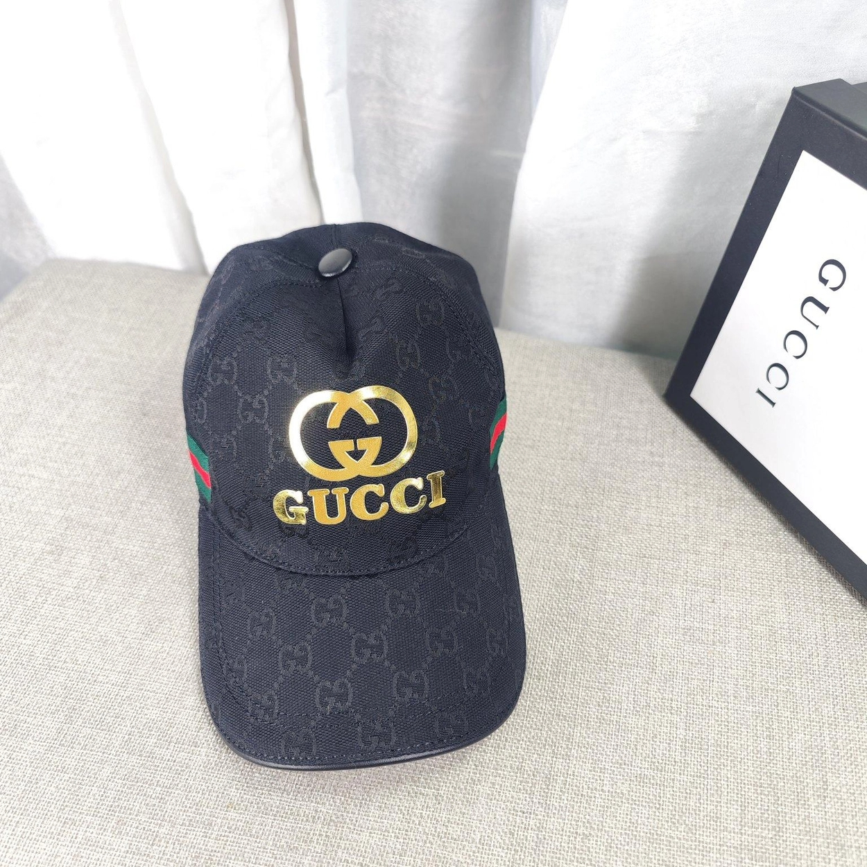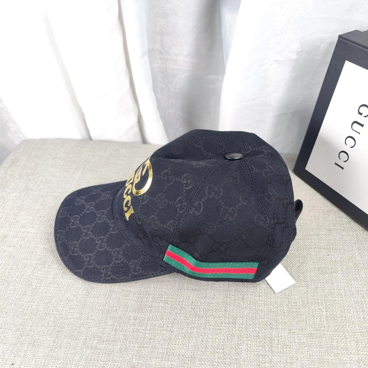 구찌 골드 로고 웨빙 블랙 베이스볼 캡